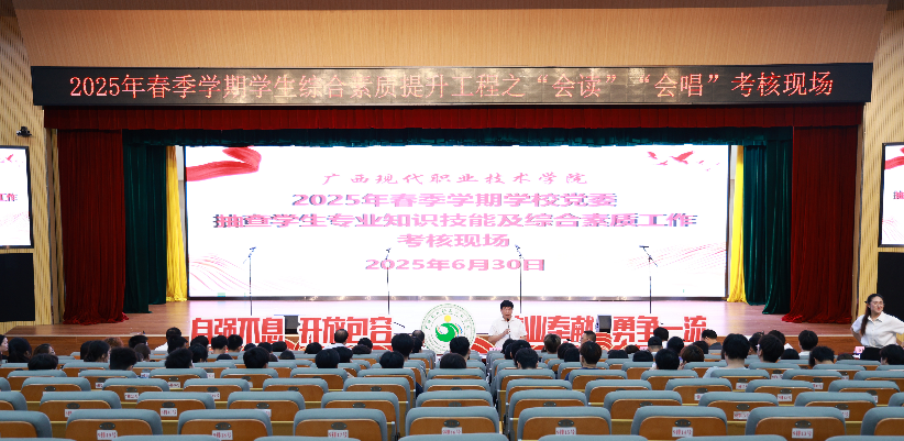 6月30日上午,我校在第二学术报告厅开展2025春季学期党委抽查学生专业知识技能及综合素质工作。河池市政协副主席、学校党委书记韦伟松教授,学校党委副书记、校长黄绍光教授,以及各二级学院书记组成的评委团出席本次抽查工作。