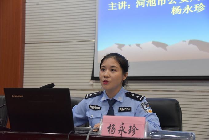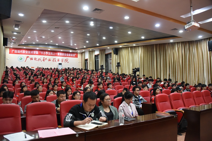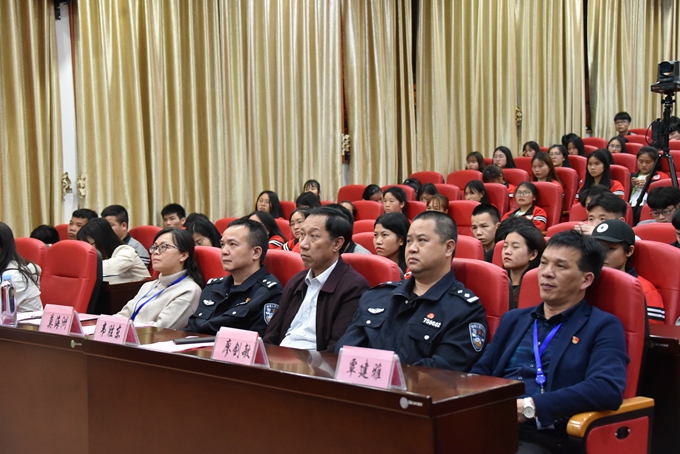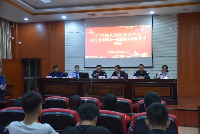 在4·15国家安全教育日来临之际,为进一步提升广大师生的国家安全意识,4月14日晚,我院第二学术报告厅举办“千万学生同上一堂国家安全教育课讲座”。学院副院长韦胜东、河池市公安局金城江分局副局长莫海洲、河池市公安局金城江分局国保大队教导员廖剑敏、河池市公安局金城江分局民警杨永珍、法制保卫处处长覃建雅出席讲座。教职工及学生代表在第二学术报告厅主会场参加讲座,各系班主任、各班学生在教室同步收看讲座直播。讲座由我院学工处处长李玲主持。