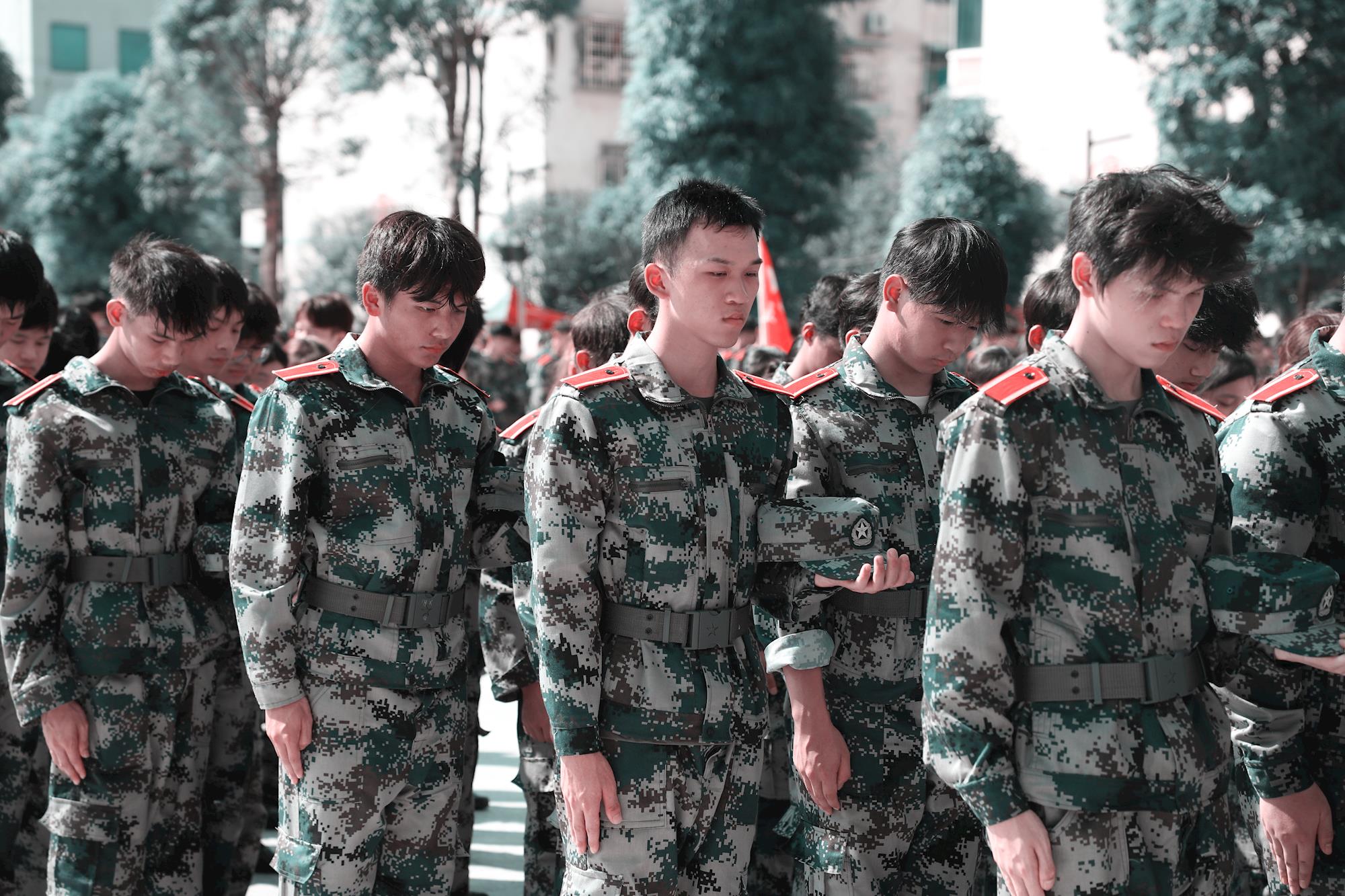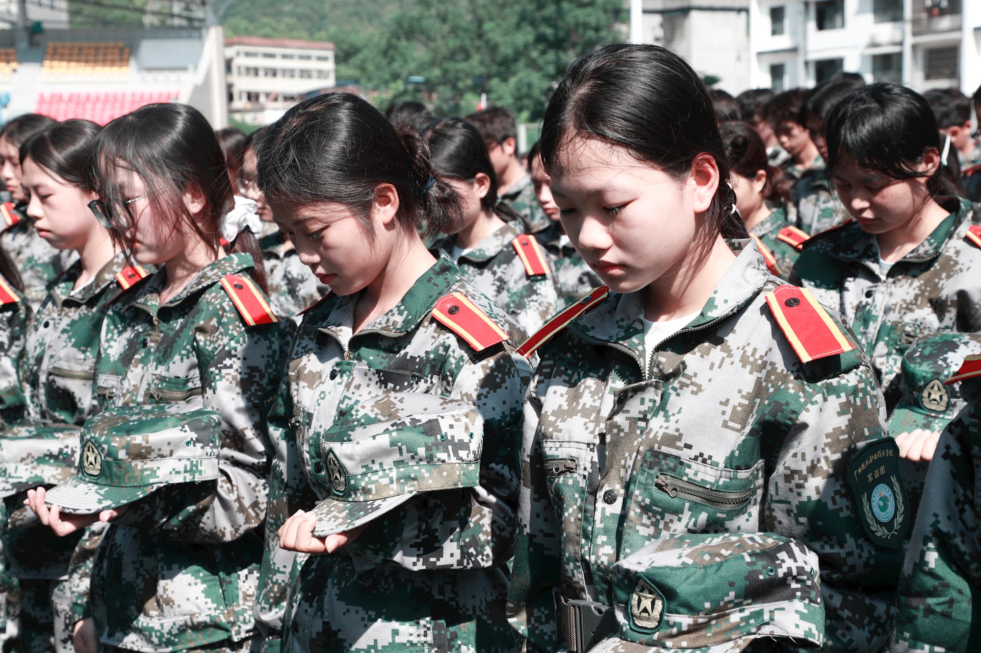10时整,警报声响彻校园的那一刻,原本热火朝天的军训场顷刻间归于肃穆。身着迷彩服的2025级新生们整齐有序地摘下军帽,低头默哀三分钟。烈日当空,汗水顺着年轻的脸颊滑落,却没有一人抬手擦拭。这一刻,五千余名新生共同用最庄重的姿态,表达对历史的深刻缅怀和对先烈的崇高敬意。