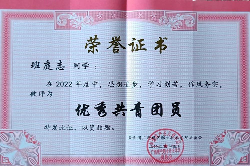 班庭志,男,瑶族,共青团员,于2021年9月进入广西现代职业技术学院机电工程学院工业机器人技术专业学习。